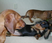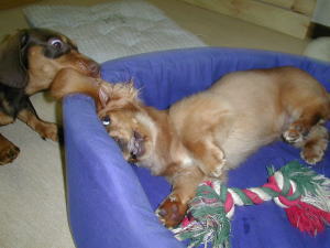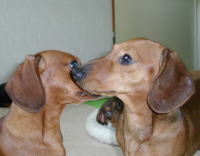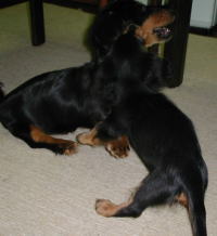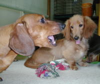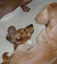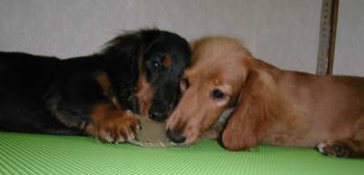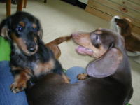 ぼくバセロンで〜す カラダはでっかいんだけど中身は幼児だから ママは面白いって笑うんで〜す ![]() 私はつい 生後5ヶ月組と同じような気分で接してしまうけど 本当はまだまだ仔犬 大きな体で無邪気に遊ぶ姿はアンバランスで面白い♪ でもねアナタのアマ噛みは超痛いのヨ! ピアジェに噛み付くのはやめてね いつも悲鳴を上げてるでしょう? ついでに思いっきりのしかかるのもやめようね 潰れちゃうから・・・ バセロンの得意技は「脱力」 捕まるとダラ〜ンと全身の力を抜きます 体がクニャクニャで扱いにくいったらないです アタシはピアジェ! ちっちゃくてもバセロンとお誕生日は1日違いなのヨ ![]() ![]() バセロンは大きくてピアジェは小さい このデコボココンビには困ってる どちらかと言えばピアジェの方が オトナかな? ピアジェをかまっていると バセロンが本気でジャマをする これに腹を立てたピアジェが 吠えまくる カラダが大きい分 バセロンはピアジェをナメている ピアジェが一生懸命攻撃してもバセロンにダメージはない のっそりしてるバセロンと 機械仕掛けの人形のように良く動くピアジェは対照的 ![]() |