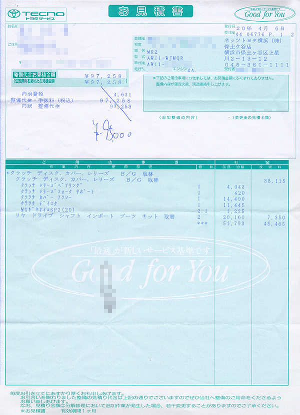 クラッチがすべり初めて約2年、だましだまし乗っていましたが、とうとう末期。 どのギアでも、滑りまくり・・・回転数だけが、ぐんと上がっていきます。 でも、自分で交換するのはめんどくさい。 そうだ、トヨタに出そう。 ついでに切れまくっていたドライブシャフトブーツも交換。 さて、完全お任せ状態での価格です。 みなさん、ご参考に。 工賃、高け〜(笑)。