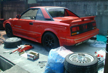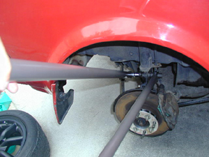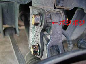 AWはストラットのボルトを緩めて、カム(上のボルトに挟まっています)を回すことでキャンバー角が変えられます。