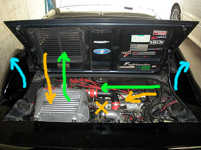 大黒Pオフでお会いし、みんカラでもお友達のsho-zさんがエンジンルームの熱気を逃がすために、FRPでダクトを自作されました(凄い!)。