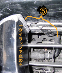 Dは分かりづらいですが、バンパーステーに挟み込んで固定。スポイラーとはタイラップで結びます。