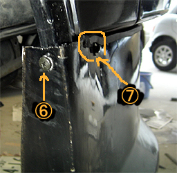Eは新たに穴をあけて固定。Fはフェンダーとスポイラーに穴をあけて、ボルトで密着させるボルト。