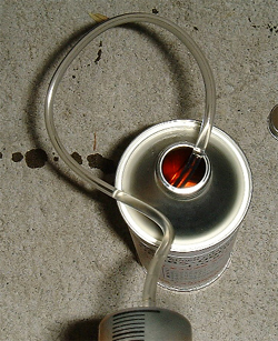 まずは、ミッキーが刺さっていた穴にホースを入れ込んで、可能な限り古いオイルを抜き取ります。