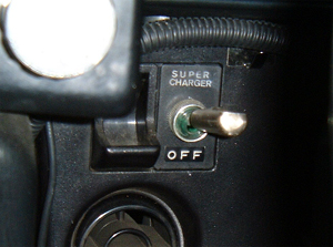 爆音マフラーをつけていると、閑静な住宅街で走行すると大変迷惑です。 よって、少しでも音を和らげようとつけました。 一般的にはECUの「S/Cリレー」に取り付けるようですが、修理書をまだ持っておらず、 インターネットのイの字も無く情報が何もなかった当時の私は、 S/C本体の配線しか見つけることができませんでした。 よって、S/Cへ伸びている線の1本をぶった切ってリレーをかまし、 室内にスイッチを取り付けました。 S/Cオフの時は、(パワーメーター読みで)50馬力そこそこしか出てませんので、 大変遅い車に変身します。