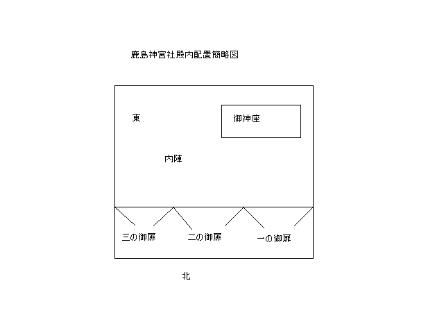 鹿島と出雲の類似点を意外なところで発見する事が出来ます。それは鹿島神宮と出雲大社の内部の配置が類似しているという点です。大社造りの特徴はいくつかありますが、その中でも神座が中心になく奥で横向きになっている点が出雲大社の最大の特徴であると見られています。ところがこれは鹿島神宮においても同様なのです。この理由としては出雲大社を創った主催者が武甕槌命である事を考えるとある意味では当然なのかも知れません。あるいはこの様式とは古代において一般的な様式だったのかも知れないと思っています。つまり出雲発祥というよりも天孫一族にとっての住居をモデルとした可能性が高いのではないでしょうか??いずれにしても出雲大社オリジナルと見られている配置を遙か東国の鹿島神宮でも見ることが出来るのです。