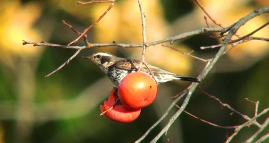 ツグミの群れがやってきて、“柿食堂”(多数の実をつけた柿の木) が繁盛していました! |