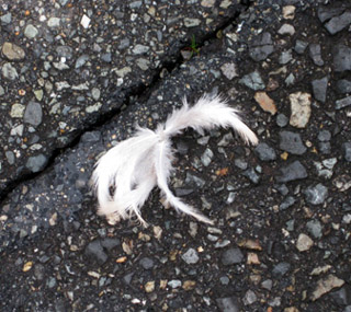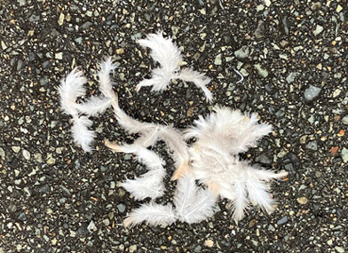 近づいてみると、それは鳥の白い羽でした。フェザーというよりダウンに近い羽です。