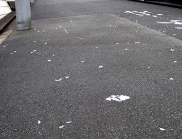 それは、2月23日の朝のこと。近所の家の前、道路になにか白いものが一面に散らばって見えます。