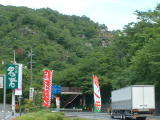 御嵩の峠を越え、御嵩町の中心へと向かい坂を下り始めると、間もなく前方の山肌にそそり立つ巨大な岩の群れが視界に飛び込んでくる。これが鬼岩で、岩の付近は景勝地になっていることもあり、鬼岩公園として整備されている。温泉もあるようだ。