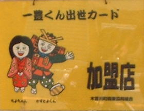 左写真は「一豊まつり」の幟と「黒田城 山内一豊出生地」の看板。2004年の一豊まつりは、8月1日あたりに開催されるようだ。祭りの内容は未確認。右が、近隣の商店街で見つけた「一豊くん出世カード 加盟店」のプレート。鎧を着ているのが「かずとよくん」、左の女の子?が「ちよちゃん」。ちょっぴり欲しい、「一豊くん出世カード」。システム・特典などは不明。