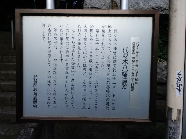 代々木八幡宮の境内には縄文時代の遺跡があり、渋谷区の史跡に指定されています。