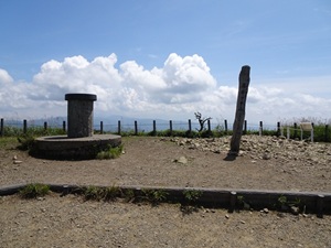 あっという間に山頂へ着いた。味気ない山頂だと思った。本来なら北アルプスがズラリと並んで見えるのだろが、そのアルプスが見えないせいかも知れない。 |