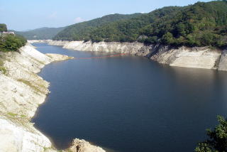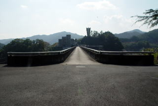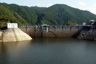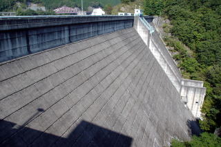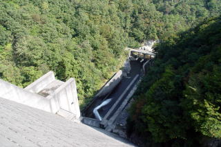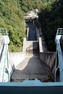 側より下流方向を撮影です。ジャンプ台式洪水吐が良く見える角度です。