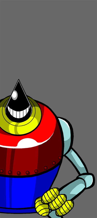 カリー国の科学者・ゴロギル博士によって開発された戦闘ロボット。 三角形の頭部に、ニヤリと笑う口があるのが特徴で、鉄人の約1.5倍もの巨体を誇る。 元々、何のために開発されたかは不明だが、土中・水中・海中を自由自在に移動し、頭部の口からは火炎を、腹部からは熱線を放射、また無数の小型ロボットを内蔵し、複数の敵と同時に渡り合う能力を持っている。 ゴロギル博士の思惑はともかくとして、このモンスターはカリー国内部の秘密結社・十字結社に奪取され、日本での武器密輸に利用された。 武器密輸と、十字結社による無差別殺戮を阻止しようとした日本警察及び自衛隊と戦闘になり、大暴れするものの、最後は鉄人の渾身の体当たりを受けて大爆発して果てた。 |