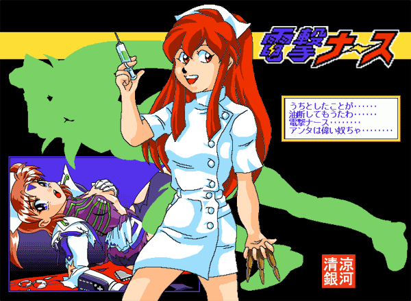 公私にわたって(?)なにかとお世話になっている『はにはに(謎)』の管理人、漢一匹☆あすか上等さまの為に描いたイラスト。 ネタはPC-98の結構変なゲーム(笑)である『電撃ナース』。 この女性は、主人公の“稲妻きらら”です。 彼女は、普段は病院に勤める普通の(?)看護婦ですが、一度事が起こればプラズマパワーで変身!! “電撃ナース”となって悪を退治するのです!! 漢一匹☆あすか上等さま、これからもよろしくお願いしますね♪