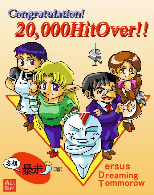 このサイト“銀河工房”との間で相互リンクをさせていただいているサイト、 片桐芯士さまの“VERSUS DreamingTommorow”が無事20000Hitを迎えたお祝いに贈らせていただいたCG。 今現在片桐芯士さまが鋭意連載中のWeb漫画『妄想暴走日記』の登場人物たちを描かせていただきました。 勢いに任せてほんの数日で描きあげたので色々と不備な点も目立ちますが、片桐さまには喜んでいただけたようで本当に嬉しいです。