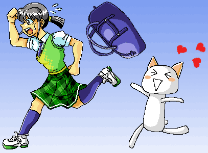 どうも、おや〜んさま。これがリベンジイラストの“トロと翼子”です。 この頃ファイルサイズを抑えるための擬似ドット絵に凝ってまして、これはその2作目です。 (1作目は他サイトの方にさしあげました) もしよろしければお持ち帰りください。 偉そうなことを色々と言った割には、『良くあるネタ』で、『中学生には見えない翼子』を描いてしまいましたが、 今はこれが精一杯・・・(;×;)。これからもよろしくお願いします。
