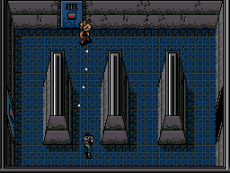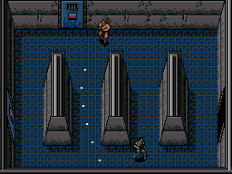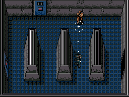 | マシンガンを乱射している隙に反対側の通路へと走る。 MACHINEGUN KIDは、SOLID SNAKEが動くと素早く反応して追いかけてくるので、壁の角にひっかかって時間をロスしないように気をつけよう。 |