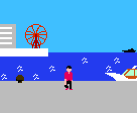 | この港からはポートアイランドの大観覧車が見てとれる・・・美しい眺めだ。が、その風景には不釣合いな・・・いかにもスジ者と思われる男がそこには待っていた。 「さっき電話くれた人だな。じゃあ、この包みを受け取ってくれ。としゆきによろしくな。」 そういって男が差し出した包みを、我々は即座に調べてみた。 「麻薬です!ボス!」 やはりな、としゆきは不合法な取引きに手を出していたのか。 「麻薬密売の現行犯で逮捕する!」 「げっ!しまった!」 男は警官に連れられて去っていった・・・やがて周辺住民に聞き込みをしていたヤスが戻ってくる。 「ボス、17日の9時過ぎ、港でとしゆきを見たという人がいました。写真で確認しています。」 ふむ、こうぞうの件はともかく、これでとしゆきは逮捕できそうだな。 「捜査本部に戻るぞ。」 「はい、ボス。」 |