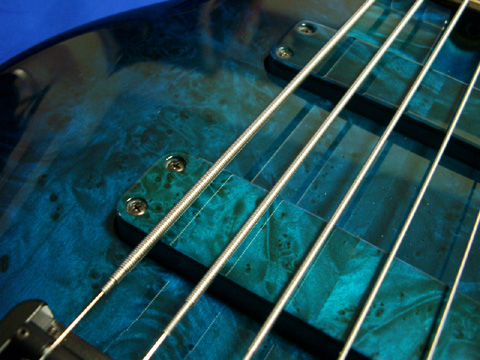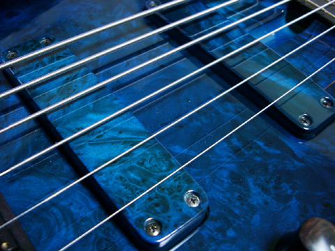 Burl MapleとBlue Burstの美しいマッチングにまず目を奪われます。ハイエンド楽器メーカーには、意味の有無は別として美しいトップ材を使用するメーカーが少なくありませんが、光がうっすら射し込む深海を想起させる、さりげないこの美しさは他ではなかなか得難いものです。