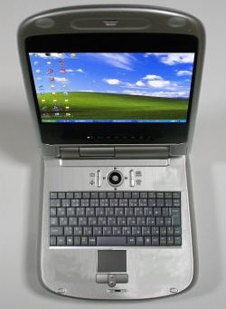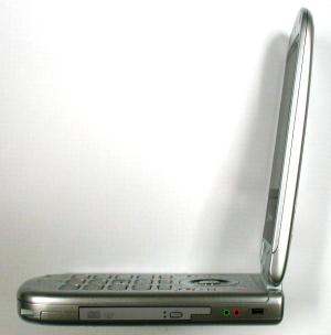 スペックはモバイルノートとしては比較的高めで、Pentium M-1.7GHzという最高クロックのPentium Mを搭載する。メモリは標準で256MBだが、空きソケットが一基あるため最大768MBまで増設可能だ。ハードディスクは60GBと大容量なので、それほど困ることはないだろう。グラフィックチップにMobility RADEON 9200(グラフィックメモリ32MB)を採用しており、最新のゲームもそれなりに楽しむことが出来る。DVD-RWドライブを内蔵し、書き込み速度はDVD-R、DVD-RW共に2倍速となる。液晶ディスプレイは上記の通り12.1インチで、XGA表示に対応するごく一般的なものだ。今はやりの光沢液晶で、表面に低反射コーティングを施すことで外灯の光の写り込みを軽減している。輝度、視野角共に特に優れている訳でもないが、問題のないレベルだ。ただ、本体形状が特殊なため、サイズの割には液晶が小さいのは残念だ。 携帯電話のように、液晶裏側にも液晶ディスプレイを内蔵している。240×80ドット最大256表示の簡単な物だが、時計は勿論、携帯に内蔵されたものとは異なりオリジナルデザインが表示できる。付属のアプリケーションでデザインが行えるようになっているのはユニークだ。 キーボードは携帯電話の様な物ではなく、しっかりしたパソコン用キーボードを搭載する。さすがにキーボードが携帯電話型では打ちにくい為、パソコン用キーボードを搭載するのは正しい選択ではないだろうか。18mmキーピッチと本体サイズの割に小さめだが、一部を除いて縮小キーも特殊な配列もないため、比較的打ちやすい。キーボード手前にはタッチパットも搭載する。キーボード奥にも、まるで携帯電話のようにボタンが配置されている。単なるデザイン性重視の飾りではなく、4方向キーの様なボタンは中心が電源ボタンで、周囲4方向がCD/DVDの操作ボタンとなっている。その周囲の4つのボタンはアプリケーションのワンタッチ起動ボタンであり、使い勝手も悪くない。