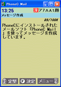 付属ソフトに携帯電話型パソコンならではの面白いソフトがある。「PhoneC Mail」というソフトだが、このソフトはその名の通りオリジナルのメールソフトだ。このソフト、携帯電話のメール作成時のデザインに似せて作られているのである。しかも携帯電話のキーに似せた「携帯電話キーボード」が付属している。USB接続のこのキーボードを接続し、このソフトでメールを打つことで、携帯電話でメールをしている気分になれるのである。このようなソフトが付属するところが、遊び心がありなかなか好印象である。