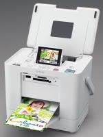 プリント機能そのものも充実している。インクヘッドは5760×1440ドットで最小2plとなる。インクは4色構成になるが、2plとインク滴が小さいことに加え、新開発の「Advanced-MSTD」に対応しており、十分に美しい印刷結果が得られる。MSTDとは3種類の異なるサイズのインクを打ち分ける技術だったが、Advanced-MSTDでは5種類のインクサイズを打ち分けることが出来るように改良されている。L判写真一枚は35秒となっており、A4プリンターの標準を上回るスピードだ。もちろん、CMでおなじみの「Epson Color」対応となっている。オートフォトファイン!EXにより、逆光などで暗くなってしまった写真も顔の部分を自動判別し補正してくれるなど、写真が簡単に綺麗に補正できる。また、インクは染料ながら耐光性や耐オゾン製を高めたPM-Gインクであり、さらに今回から耐光性が50年、耐オゾン製が25年にアップしている(従来は耐光性が20年、耐オゾン製が10年)。残念ながらインクは4色一体となっており、無くなった色だけ交換できない。特にブラックインクまで一体になっているのは通常のプリンタなら問題だが、E-700なら文字原稿を印刷することもないと思われるので、それほど問題ではないだろう。 メモリカードからのダイレクト印刷に対応しているだけでなく、赤外線通信やPictBridgeにも対応しているので、様々な方法でダイレクトプリントが楽しめる。角度調整可能な2.5インチ液晶も内蔵しているため写真の確認も簡単だ。スロットはコンパクトフラッシュ(CF)やSDカードスロット、メモリースティック(MS)、xDピクチャーカードに対応している。もちろん通常タイプだけでなく、コンパクトフラッシュスロットはマイクロドライブに、SDカードスロットはSDHCカードに、xDピクチャーカードスロットはTypeMやTypeHに、メモリースティックスロットはPROタイプにも対応しているので、スマートメディア(SM)以外一通り対応しているという安心感がある。このスロットに挿したメモリカードの写真は、内蔵ドライブによってCD-Rへの書き込みが行えるのは先ほど書いたとおりだが、それ以外にUSB端子に挿したUSBフラッシュメモリや、MOドライブ、DVD-Rドライブなどへの書き込みも行える。また逆にそれらのドライブからのダイレクト印刷にも対応している。もちろん、内蔵のCD/DVDドライブに写真の入ったCDやDVDを入れても印刷可能だ。つまりCDにバックアップしてメモリカードから消した写真でもダイレクト印刷ができるのだ。 対応している用紙はL判写真やハガキ、カードサイズに加え、新たにL判より大きいKGサイズまで対応している。B5やA4用紙には対応しない反面、本体サイズが215×152×176mmとコンパクトで、重量も3.0kgなので手軽に持ち運べる。さらに別売のリチウムイオンバッテリを取り付けることで、コンセントに挿さずに100分間の印刷が可能になる。L判写真なら120枚印刷できると言うことなので、キャンプなどに持っていってその場で印刷と言った事も可能なのだ。ここでも内蔵のドライブが力を発揮し、写真をその場でCDに書き込んで友達にあげるという使い方も可能だ。 実売価格は32,000円(2006年9月末現在)。プリンタとしては安くはないが、ダイレクト印刷からCD-Rへの書き込みまで出来て、さらにバックアップしたCDからのダイレクト印刷も可能なので、これ一台でパソコンなしでも安心だ。デジカメを持っているがパソコンを持っていない人はもちろん、わざわざパソコンを使うのが面倒だという人、パソコンでCD-Rの書き込み方法が分からない人、コンパクトなプリンタが欲しい人、屋外で写真を印刷したりCDに書き込んで他の人にあげるのおもしろそうだと思った人など、様々な人にオススメできるプリンタである。また、E-700からCD/DVDドライブを外す代わりに更にコンパクトなE-500(実売価格25,000円)や、液晶を2.0インチ、インクを3plのMSTDに変更し、赤外線通信機能や写真にフレームや飾りを付ける機能を省いきバッテリにも非対応のE-300(実売価格18,000円)もあるので合わせて検討して頂きたい。