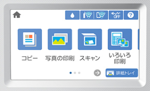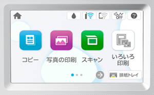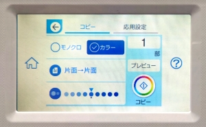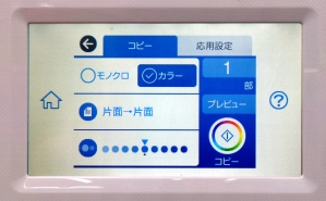 最後にEP-885Aの操作パネルやインタフェースなどを見てみよう。EP-885Aの液晶サイズや操作性はEP-884Aから変更されていない。ただし、ホーム画面等の「コピー」「写真の印刷」「スキャン」が、スマホ向けアプリ「Epson Smart Panel」の各ボタンと同じ色に変更され、分かりやすくなっている。それ以外のボタンも、青ベースから白ベースに変更され、背景にも薄く柄が付いておしゃれになっている。コピー画面などでも、項目やボタンの配置はそのままながら、色合いやタブのデザインなどに変更があるほか、画面左上の「ホームへ戻る」ボタンが、ホーム画面での各ボタンと同じ色に塗られている。 |