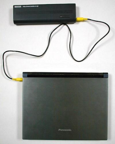 カタログでも下の方に小さく載っているだけの機種である。あくまでもキワモノ製品なのかなかなか見つからない。ようやくヨドバシカメラで商品を見つける。23,800円也。 早速帰って箱を開けてみる。第一印象は「まあこんなものだろう」と言ったところだ。重さも予想していた程度であり、特別重くも感じない。 製品自体は2つのパーツ+ケーブルで構成されている。大きい方の縦長の物体がバッテリ本体であり、小さい方は充電器である。その他数本のケーブルが同梱されている。 バッテリを使うには、バッテリの右コネクタに付属のケーブルを差し、その先をパソコンのACアダプタ用コネクタに挿すだけだ。これによりパソコンはACアダプタから電源が供給されていると勘違いする訳だ。充電する際はバッテリの左のコネクタに充電器の短いケーブルを接続する。そして充電器から延びているコンセントを挿せば充電が始まる。この際に気をつけるのは充電器は左、パソコン本体は右のコネクタに挿すと言うことだ。これを間違ってはいけない。ところが、どちらも形状が同じであるため間違って挿すことも「物理的」には可能なのだ。警告シールが貼ってあるものの、間違えやすいことは確かだ。間違わないように形状を変えるなどの改良を望みたいところだ。ちなみに、充電しながら使用することもできる。 電力残容量のLEDには驚かされた。実際にパソコンに接続して使い始めたのだが、LEDが点灯しないのである。その前に充電をした時には確かに点灯していた。故障か?と思いながら説明書を見ると、ボタンを押した時だけ数秒間点灯することが分かった。どうやら全てがLEDだと思っていたが1つはボタンだったようだ。押してみるときちんと点灯した。確かに常に点灯させていると電力を消費するので理にかなっているのだが一瞬驚いた。