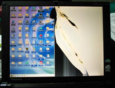 メキッ!。これは我が家のノートパソコンから聞こえてきた音である。もちろんお分かりの通り、正常なノートパソコンからはこのような音は聞こえない……。と、前回と似たような書き始めになってしまった。 前回はデスクトップパソコンであったが、今回はノートパソコンが壊れてしまった。2002年12月9日のことである。正確にはノートパソコンのディスプレイが割れてしまったのである。床に液晶ディスプレイを閉じた状態で置いていたのが悪かった。思わず上から体重をかけてのってしまい、メキッっという音がしたときは遅かった。写真のような状態になってしまったのである。表面のガラス面は割れ、中では液状の物が漏れている。右半分は完全に表示できなくなってしまった。