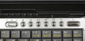 キーボード上部にはワンタッチボタンが用意されている。音楽CD/DVDの操作ボタン4つ(CD/DVDプレイヤボタン)とアプリケーションの起動ボタン(ワンタッチスタートボタン)が2つだ。このワンタッチスタートボタンは、初期設定ではインターネットとメールが割り当てられているが、もちろんユーザーが自由に起動するアプリケーションを設定できる。この点に抜かりはない。 その左横の切り替えスイッチもなかなか便利だ。この切り替えスイッチは「ワイヤレススイッチ」と呼ばれる物で。「無線LANのオン/オフ」を切り替えるスイッチなのだ。物理的なスイッチによって無線LANを切ることが出来るので、外出時など無線LANを使わないときは簡単に機能を切ることが出来、消費電力を抑えることが出来る。これらボタンは銀色で、なかなかの高級感を醸し出している。