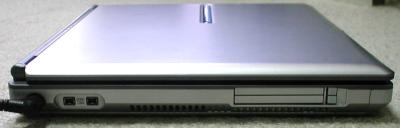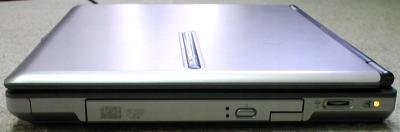 では右側面を見てみよう。まずど真ん中にDVD/CD-RWコンボドライブが配置される。このドライブは拡張ベイに内蔵されているので、取り外して拡張ベイカバーを取り付けることで軽量化が可能だ。ただし、このカバーはオプション扱いとなっており、付属はしていない。つまり軽量化を図るためにはカバーを購入する必要がある訳だ。これは価格を少しでも抑えるためと言うことだ。確かに外出の際であってもコンボドライブを取り外して使うことは考えにくいので、少しでも本体価格が安いのはうれしい所だ。 その右側のダイヤルは音量調節ダイヤルだ。キーボードを使用して音量調節を行う場合と異なり、直感的に行える点が好印象だ。一番右の光っているのはワイヤレスランプだ。無線LANをONにしているときは光るので、現在の無線LANの状態が一目で分かる。この辺りはさすがメーカー製パソコンというところだ。