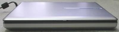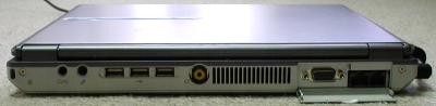 続いて背面だ。一番左側にはマイクとイヤホン端子が並んでいる。背面に配置するのは一長一短がある。スピーカーを接続する際は背面にイヤホン端子がある方がコードが邪魔にならない。しかし、イヤホンを接続するとなるとコードが液晶の裏側から出ているので邪魔になる。だからといって前面だとスピーカーを接続するときに困る。側面に配置するのも中途半端と言える。つまりスピーカーを接続するには便利で、イヤホンを接続するには不便な配置となる。ただ、筆者の使い方を考えると気になる点だ。モバイルパソコンなので持ち運んで使うことが考えられる。その際、スピーカーを持ち運んで接続するとは考えにくい。外出先で音を出す際は内蔵スピーカを使うだろう。それよりも電車の中や移動先で音が漏れないようにイヤホンを繋ぐことが多いのではないだろうか。となると、前面かせめて側面に配置されている方が使いやすいのではないだろうか。 その右横にはUSB端子が3基並んでいる。3基ともUSB2.0に対応しているので、外付けのハードディスクやROMドライブを繋ぐ事も出来る。また3基というのはモバイルパソコンとしては多めだが、お陰でマウスを繋いでも2基余る。例えば外付けTVチューナユニットと書き込み系DVDドライブを同時に接続する事ができる。 真ん中にあるのは映像出力端子だ。もちろん、DVDをTVの大画面で見る事が出来る。また、DVDの映像だけでなく、パソコンに表示されている映像をそのまま出力することも出来るので、ゲームやWindowsの操作をするところをTVに出力することが出来るので、さまざまな用途に使えそうだ。例えば、旅行先で皆でゲームをするときにTVに表示しても良いだろう。色々と便利そうだ。 その横のスリットは排気口のようだ。排気口が背面に用意されているのは、一見何でもなさそうで実によく考えられている。最近は消費電力が増えているので排気口から出る風もある程度暖かい。冬ならば「暖かい」で済みそうだが、夏に当たれば不快に感じるだろう。実は友人の買ったパソコンは右側面に排気口があったために、マウスを操作する際に温風が当たり不快に感じてしまうと言うことだ。その点、本機は背面にあるのでその心配がない。初めから背面にあったためこの「優れた点」に気づかなかったが、友人の話を聞き本機の排気口の配置が優れていることに気づいたというわけだ。 右端には、外部CRTコネクタ、LAN、モデム端子が並んでいる。これらはカバーが付けられている。滅多に使わないという事でカバーが付けられているのかもしれないが、外部CRTやモデムはともかく、ブロードバンドが普及している今、LANコネクタには常時ケーブルが接続されている人も多いのではないだろうか。となると、カバーは常に開いた状態になってしまう。LANだけはカバーない部分に設置するか、カバーをそれぞれの端子ごとに付けた方が良かったのではないだろうか。もっとも、これからは無線LANを使うようにという事なのかもしれない。