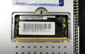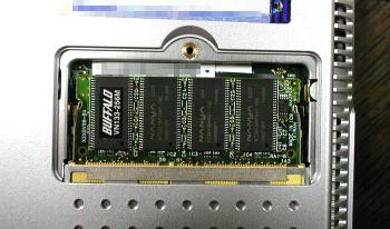 標準で256MBを搭載するものの、足りないと感じる場面もありそうなので、パソコン購入の直後にメモリの増設を行った。ここで256MBを増設し512MBとするか、512MBを増設し、最大の768MBとするかの選択となる。最近はメモリもかなり安いので512MBを増設することも考えたが、予算の問題もありとりあえず256MB増設で妥協することとした。メモリは本機に正式対応対応しているバッファロー(購入時にはメルコ)の「VN133-256MY」を選択した。 Let's note/A77の時はキーボードを外してメモリソケットにアクセスするという、結構大変な作業であったが、本機は拍子抜けなほど簡単であった。本体裏面のメモリソケットのフタ部分のネジを一本外すと、フタが取り外せる。すると、メモリソケットが姿を現すので、ソケットに斜めに差し込んだあと倒せば増設完了だ。