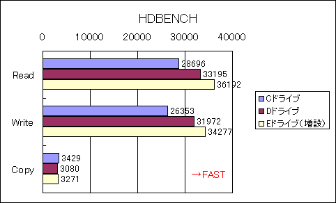 さて、無事メモリの増設が完了したところで、HDBENCHを使って、従来のハードディスクと増設したハードディスクの転送速度を測ってみることにした。 なお、内蔵ハードディスクは既に半分以上の容量が使われているが、増設したハードディスクは何も入っていない状態だ。そのため、テストに使うディスクの部分が異なる。内周と外周では転送速度に差があるので、ドライブ自体の性能差をはかることは出来ないが、増設したハードディスクが、元々のハードディスクと比べて大きく劣らないか知ることにしよう。