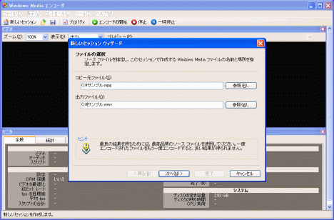 ここで、変換するファイルを選ぶ。2つあるファイル名の内、上段は変換する元ファイル、下段は変換したファイルの出力先だ。変換元のファイルがWindows Media Video(WMV)形式の動画で無い場合は、変換元と変換先で拡張子が異なることになるので、ファイル名は同じでも良い。そして、「次へ」をクリックする。