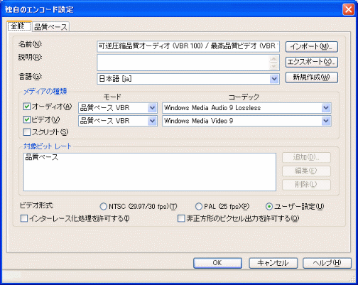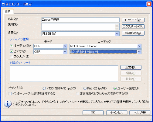 「独自のエンコード設定」の画面が開くので、ここでまず「新規作成」ボタンを押す。すると名前やビットレートの欄が白紙になり、メディアの種類欄も初期設定に戻るので、そこで、以下のようなザウルス用の設定を行っていくことになる。