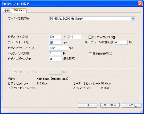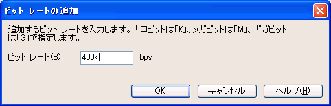 ここで「動画+音声」の合計ビットレートを入力し「OK」をクリックする。この際後ろにキロの「K」を付けるのを忘れないようにしよう。上の画面では400Kbpsを設定した。