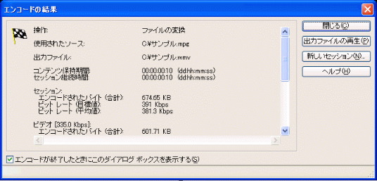 この画面が出たらエンコード完了である。指定した場所にファイルが出来ているハズである。このファイルをザウルスに転送するか、コンパクトフラッシュやSDメモリーカードなどに入れ、ザウルスに挿せば完了だ。