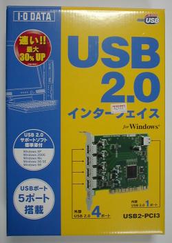 前回、VAIO PCV-RX66へのUSB2.0インターフェイスカードの増設に失敗したのだが、そのまま「失敗しました。残念でした」で終わらせる訳にはいかないのだ。というのも、増設が成功すると見越した上で、USB2.0機器を購入してしまったのである。このままでは、この外付け機器が真価を発揮することが出来ない。そこで、急遽別のUSB2.0カードを購入することにした。 選んだのはI・O DATAのUSB2-PCI3だ。別にI・O DATAの製品でなくても良いのだが、購入したUSB2.0機器がI・O DATA製であるため一応同じメーカーを選んだと言うこと、「従来製品より30%高速化した」と書かれている事が決め手だ。また、同じI・O DATAからLowProfile PCI対応の「USB2-PCIL3」が発売されているが、LowProfile PCI対応でなくても大丈夫であり、そのわりにUSB2-PCIL3は端子数が1つ少ないため、USB2-PCI3を選択した。