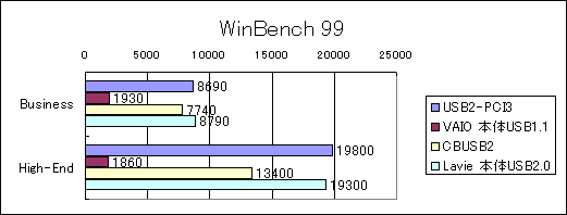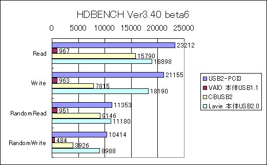 これを見る限り、今回増設したUSB2-PCI3がトップである。同じUSB2.0であるLavie M内蔵のUSB2.0インターフェイスとの比較では、HDBENCHのREAD性能で1.23倍、Write性能で1.16倍高い値を示している。WinBench99の結果でもほぼ同等の値を示しており、性能面では十分満足できると言える。PCIスロットに増設した場合でも、元から内蔵されていた場合と同等以上の性能が出ることが判り、安心した。また製品のうたい文句の「従来より30%高速」というのは、30%に満たない物のかなりの差が出たのは事実だ。同じUSB2.0でここまで差が出るというのは正直驚きである。 ちなみにCBUSB2は、USB2-PCI3より30〜60%も低い値となっている。この傾向は、試しにLavieM LM500/4EのPCカードスロットに挿して計測してみたが似た結果であったため、VAIO PCV-RX66のPCカードスロットに問題がある訳では無いようだ。原因としては、CBUSB2がUSB2.0製品としては初期の製品に当たる事が考えられるが、それにしては差が大きすぎるような気もする。PCIスロットとPCカードスロットの違いという可能性も考えられるが、ハッキリしたことは不明である。ただ、この結果を見る限りでは、PCカードスロットのあるデスクトップパソコンでも、可能ならばPCIスロット用の製品を増設した方が良い可能性があるようだ。 また、VAIOの内蔵USB1.1端子は、予想通りかなり遅い。ベンチマークテストがなかなか終了しなかったのもうなずける。HDBENCHでUSB2-PCI3の4〜8%、WinBench99で9〜22%程度の値しか出ていない。これではさすがに遅すぎると言えるだろう。ハードディスクやDVDドライブを接続しても使い物になるレベルではないだろう。また、メモリカードリーダー・ライターやUSBメモリなども、100MBを超えるデーター転送の場合はUSB2.0でないと待ち時間がかなり長くなることが考えられる。やはり、これからはUSB2.0に対応した機器を購入するべきだろう。 今回の増設は成功……いや、性能的にも同じUSB2.0同士で比べてもかなり高速だったので、「大」成功といえるだろう。これで購入したハードディスクやDVD±RWドライブが無駄にならずに済む。また、今後はUSB2.0機器が増えていくだろうと考えられるため、晴れて我が家のパソコン2台ともがUSB2.0に対応したのは大きな安心感がある。使っているパソコンがまだUSB2.0に対応しておらず、周辺機器を購入する予定がある場合は、ついでにUSB2.0インターフェイスカードの増設を検討されてはいかがだろうか。 (H.Intel) ■今回の関係メーカー・ショップ I・O DATA http://www.iodata.jp/ | |||||||||||||||||||||||||||||||||||||||||||||||||||||||||