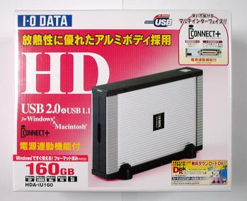 デスクトップパソコンのPCV-RX66でテレビ録画を繰り返していると、ハードディスクがすぐに足りなくなる。そこで、ロードテスト第10回で120GBのハードディスク(内蔵)を増設し、合計240GBとなったが、この頃それでも足りなくなってきた。そこでさらなる増設を考えたのだが、3.5インチベイには余裕がない。つまりこれ以上のハードディスクの内蔵は不可能である。そこで、外付けハードディスクを購入することにした。 価格を見ると120GBの製品が14,800円前後、160GBの製品が16,800円前後、250GBの製品が24.800円前後である。120GBの製品と160GBの製品の価格差は小さいが、250GBの製品との価格差はそれなりにある事がわかった。容量あたりの価格で考えると、160GBの製品と250GBの製品は同じくらいだが、現実問題として25,000円近い金額を出すのは結構つらい。そこで、160GBの製品を購入することにした。各社の製品を調べたところ、価格や製品、サイズなどからI・O DATAの「HDA-iU160」を購入することにした。 HDA-iU160はUSB2.0接続のごく一般的な外付けハードディスクである。内蔵するハードディスクの回転数は5400rpmと標準的で、高速な7200rpmのタイプではないが、その分静穏性は高いだろう。また、アルミボディを用いることでファンレスを実現しているおり、この点もうれしい。実は、ずいぶん前にSCSI接続の8.4GBハードディスクを持っていたのだが、ファンの音がそれなりにうるさかったのを覚えているが、進化したものである。しかし他のメーカーでもファンレスの製品は多いので、特別この製品を選ぶ理由にはならなかった。ではなぜHDA-iU160を選んだのかというと、「i・CONNECT PLUS」端子があることだ。この製品は基本的にはUSB 2.0接続だが、i・CONNECT PLUS端子に専用のケーブルをつなぐことで、IEEE1394接続をしたり、ネットワークに接続したりできるようになっているのだ。現状ではUSB接続以外をするつもりはないが、他の性能が同じなら、コネクタがついていないよりは、ついている方が良いだろう。