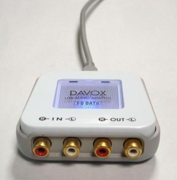 音声を入力するのが目的なので、ピンジャック(赤と白の端子)を繋ぐことができるSUB接続の機器が一番適しているだろう。調べてみると、USB接続のオーディオ入出力インターフェイスは様々な製品が出ている事が判った。デジタル入出力が出来る機種もあるが、今回の目的ではそれほど高機能で無くても良い、とりあえず、ピンジャックの入力端子があれば良い。そこで、I・O DATAのDAVOXに決定した。ピンジャックの入出力端子だけが並んでおり、USBバスパワーで電源供給が出来るので、ACアダプタ不要なのも良い。ケーブル1本で動作するので、ケーブルがゴチャゴチャにならないだろう。サウンド録音・加工・編集ソフトウェア「Sound it! LE 3.0 for Windows」が付属しているため、録音する際や録音した音楽を曲ごとに分割する際に専用ソフトでやりやすいはずだ。ヨドバシカメラで9450円也。