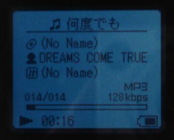 液晶ディスプレは7行表示が出来るタイプだ。再生中は上記の写真のような表示となる。曲名や歌手名、アルバム名から、フォルダ内の曲数と曲番、曲の再生位置のバーも表示される。また、形式やビットレートまで小さいながら表示されている。液晶が大きいため、切り替える必要もなくさまざまな情報を一度に見る事ができ、非常に便利だ。