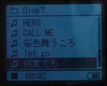一方曲を一覧から選択するときは上記の写真のような表示になる。曲名の一覧が表示されるが、7行表示中5行が曲名一覧に当てられているため、一覧性が高く選択しやすい。また、カーソルキーを押したときの反応も早く、ストレスはない。これは液晶を大型化しやすいハードディスクタイプならではの利点だろう。
