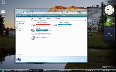 デスクトップ画面に「コンピュータ」を開いたところである。デスクトップ画面を見てまず思うのは黒を基調にしたシックな画面が良い感じという事ある。Windows XPでは青が基本だったが、今回はより大人っぽいデザインになっている。スタートボタンは今回より「スタート」の文字が無くなり、しかも丸くなった。丸の中にWindowsマークだけになったので、今までのように、「ソフトの起動などの『スタート』はここを押すことから」というイメージはなくなったが、Windowsを「終了」させるのに「スタート」を押すというのも初めての人には違和感があるらしいので、これで良いのだろう。 アイコンは随分美しいものになった。これまでの「アイコン」と言うよりはCGデザインのようになり、ある意味MacOS Xに近いと言える。右側には「サイドバー」と呼ばれる、Windows Vistaの特徴となるバーがある。上の画面では初期状態なので、アナログの「時計」と「スライドショー」と「フィード ヘッドライン」が表示されている。これら一つ一つは「ガジェット」と呼ばれるが、このガジェットは追加や削除が行える。今のところガジェットの一覧には11個が登録されている。