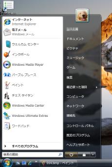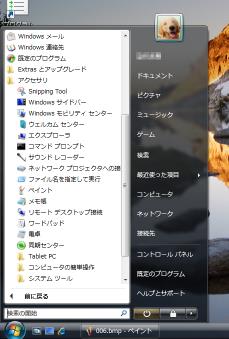 スタートメニューは、構成自体はWindows XPに近いように見える。ただ右半分が半透明になっており、後ろに隠れたウィンドウなども透けて見えるのが便利だ。また、下部に「検索」のための入力欄が用意され、簡単に検索できるようになっている。さらに、各項目にカーソルを持っていくと、右上のアイコン(画面では犬の写真の部分)が、対応したアイコンに変化するようになっている。 操作する上で一番違うのが「すべてのプログラム」をクリックした時の動作だ。Windows XPまでなら、右側に大きく一覧が表示され、その中の項目にカーソルを持っていくとさらに開くという風になっていた。Windows Vistaでは下の画面の様に、スタートメニューの左半分の「インターネット」や「すべてのプログラム」があった部分にプログラムの一覧が表示される。