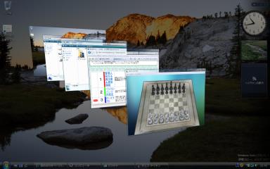 Windows Aeroの機能として面白いのが、「Windowsフリップ」である(上記画像)。スタートボタン右のウィンドウが重なったようなアイコンを押すか、「Windowsキー」+「Tabキー」で呼び出すことが出来る。これを押すと、現在起動中のアプリケーションウィンドウが、重なった状態で3D表示され、斜めから見ることが出来る。あとは目的のウィンドウをクリックすると、そのウィンドウが最前面になる。また、一番奥にはデスクトップ画面も表示されており、これをクリックすると全ウィンドウが最小化される。今までの「Altキー」+「Tabキー」と比べて目的のウィンドウが見つけやすいが、ここまでする必要があるかは疑問だ。とりあえず、Aeroに3Dグラフィック性能が必要なのが分かったような気がする。ちなみに、従来の「Altキー」+「Tabキー」も健在で、従来のアイコンを見て切り替えるのではなく、小さく表示されたウィンドウを見て切り替えられるので、こちらも便利になっている。