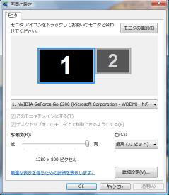 Windows XPの画面のプロパティの「設定」タブとよく似ている。ただ、Windows XPの様にタブで切り替えてスクリーンセーバーなどを設定することが出来ない。タブのような形で「モニタ」と書かれているにもかかわらず、タブが一つしかないのが何とも言えず寂しい。他の項目を設定するなら、一度OKを押して、新たにウィンドウを開かなければならない。これは前の方が便利だったように思う。
