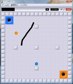 次はインクボールというゲームである。ボールが画面内をバウンドしているので、うまく誘導して同じ色のホールに入れるゲームである。画面上にマウスで線を引くことができ、これにボールが当たると、線の向きによってボールが反射する。これをくり返してボールを誘導するのである。引いた線は一度ボールが当たると消える。別の色ホールに入れてしまったら失格である。その他、何の色も与えられていないただの穴や、玉の色を変えるブロック、ボールを鍵にぶつけると消えるブロックなど様々なものがある。低いレベルで練習して、徐々に高いレベルにしてルールを学んでいくのが良いだろう。
